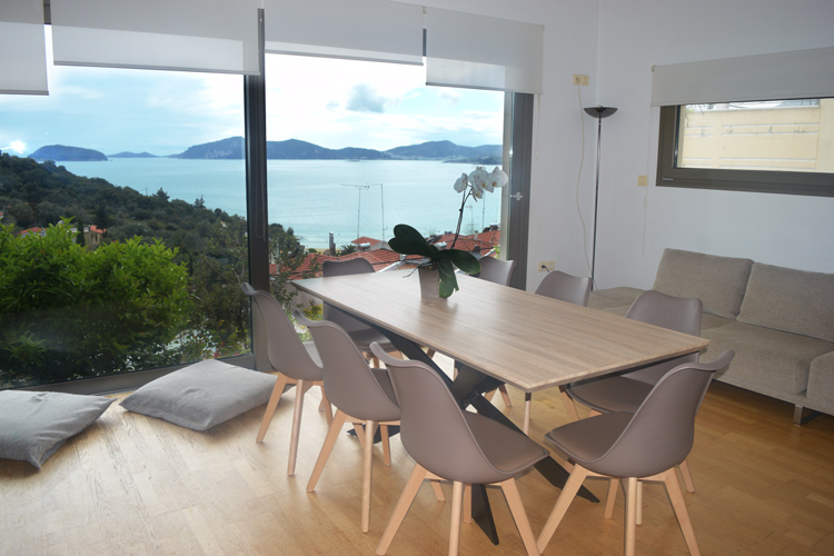 Η κουζίνα στον 1ο όροφο – μπορείτε να μαγειρεύετε, να μιλάτε με την οικογένειά σας, να απολαμβάνετε τη θέα στη θάλασσα ή να παρακολουθείτε τηλεόραση ταυτόχρονα.