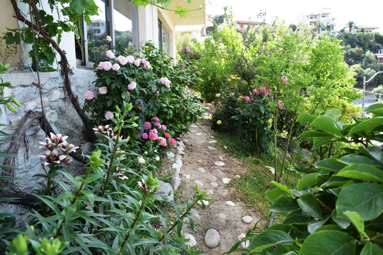 Ανθισμένες τριανταφυλλιές στο κήπο της Βίλας Feel the Sea