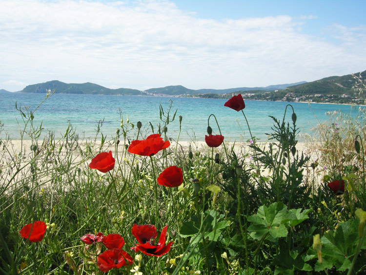 Χιλιάδες ανθισμένες παπαρούνες στη παραλία Γλάστρες δίπλα στη βίλα Feel the Sea, Παληό Καβάλας, Ελλάδα