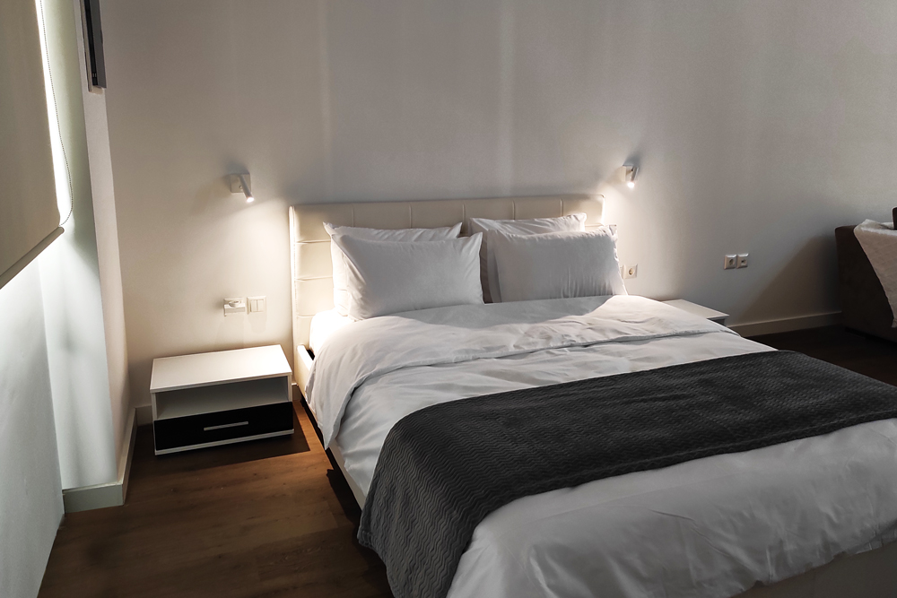Feel the Sea Studio can accomodate with comfort up to 4 persons. There is a an extra-large king-size double bed and large folding sofa-bed in the bedroom area. An inner dining area has a table and the chairs and a fully equipped kitchen. A bathroom with toilet and shower has free toiletries. The studio is equipped with everything that necessary for a comfortable stay: floor heating, hot water, air conditioner, fully equipped kitchen with oven, electric stove, refrigerator, cutlery, crockery washing machine, ironing facilities, Wi-Fi, flat-screen TV etc.