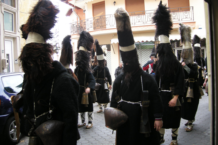 The actors wear sheepskins, their faces are painted in black to intimidate the spectators, and bells are fastened to their belts. The bells in the costumes of the actors come from the traditions of Dionysus. In ancient Greek mythology, Dionysus is the god of winemaking, fertility and fun. The purpose of the bells is to wake up the nature from winter sleeping.